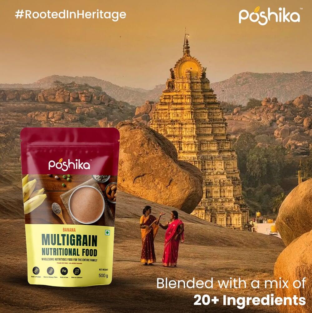 - In a vessel mix three spoonful of Poshika Banana Multigrain Nutritional Food with 1 cup of milk or 1 cup of water, stir well with a spoon so that no lumps are formed.